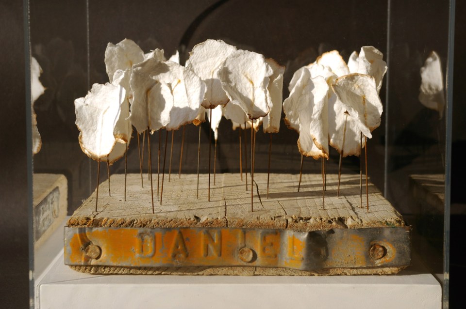 The paper is coloured with dirt and pigment from the rusty wire. I love working with paper pulp because it has such a receptive surface. The cast shapes are made to catch the light and to cast shadows.
