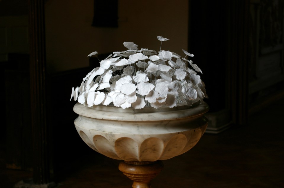 An accumulation of individual elements placed to catch the light. Made in response to the Tudor setting of the Papertrails residency